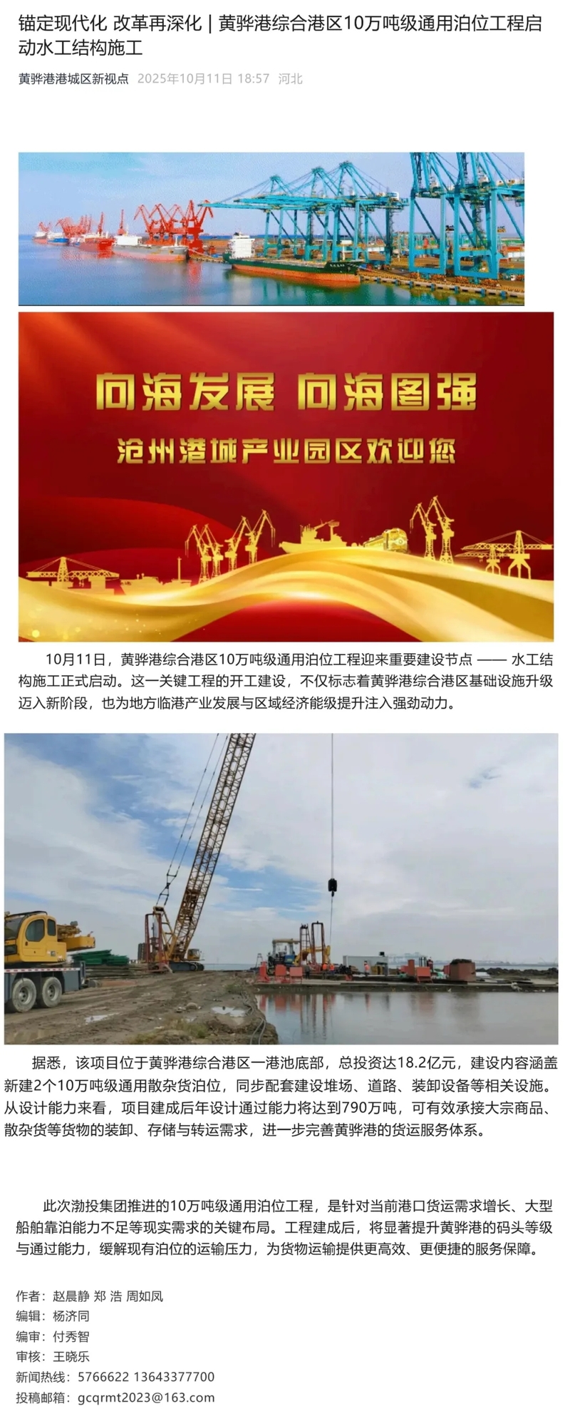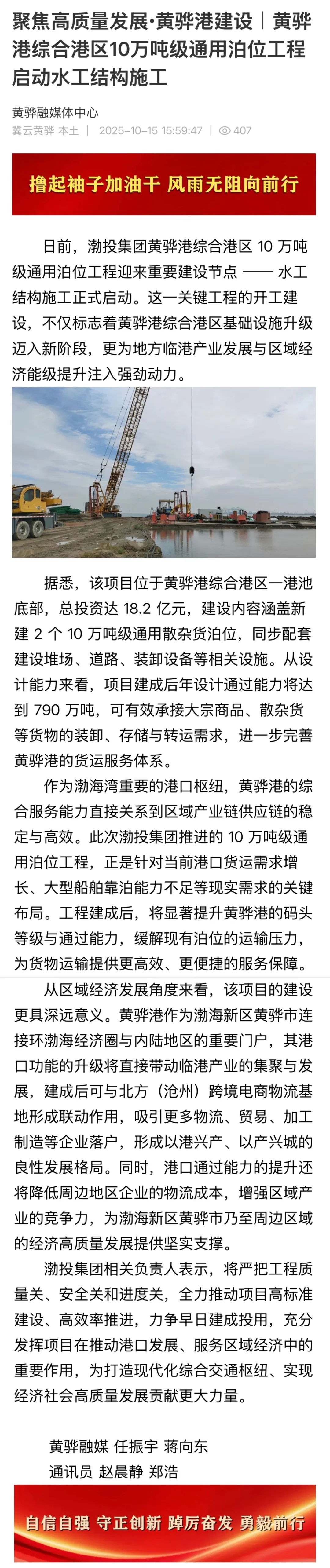 近日,渤投集團(tuán)黃驊港綜合港區(qū)10萬噸級通用泊位工程迎來重要建設(shè)節(jié)點(diǎn) —— 水工結(jié)構(gòu)施工正式啟動,人民網(wǎng)、長城新媒體、滄州日報(bào)、滄州電視臺、黃驊融媒、港城融媒等各級各類官方媒體陸續(xù)刊登報(bào)道。↓↓↓人民網(wǎng)長城新媒體冀云客戶端滄州電視臺黃驊融媒港城融媒